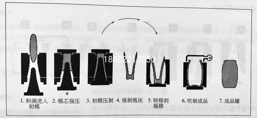 玻璃瓶罐的生產(chǎn)在兩個(gè)主要階段內(nèi)進(jìn)行:在第一階段形成口模模具所有的細(xì)節(jié),完成瓶口包括內(nèi)開(kāi)口,但該玻璃制品的主體形狀會(huì)比其最終尺寸小得多。這種半成型的玻璃制品被稱(chēng)為型坯,在下一個(gè)瞬間,它們將會(huì)被吹制成為最終的瓶罐形狀。